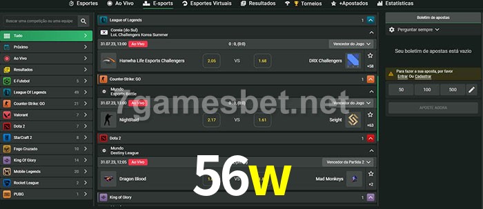 O 56w oferece uma grande seleção de opções de apostas em e-sports com probabilidades competitivas